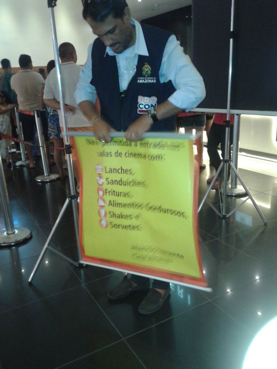 Uma equipe de fiscais do Procon Amazonas retirou na tarde dessa quarta-feira, 07, cartazes afixados no saguão de uma rede de cinemas localizada em um shopping da zona norte de Manaus. Os cartazes continham avisos que restringiam a entrada de pessoas com alimentos que não fossem adquiridos nas dependências do próprio estabelecimento.