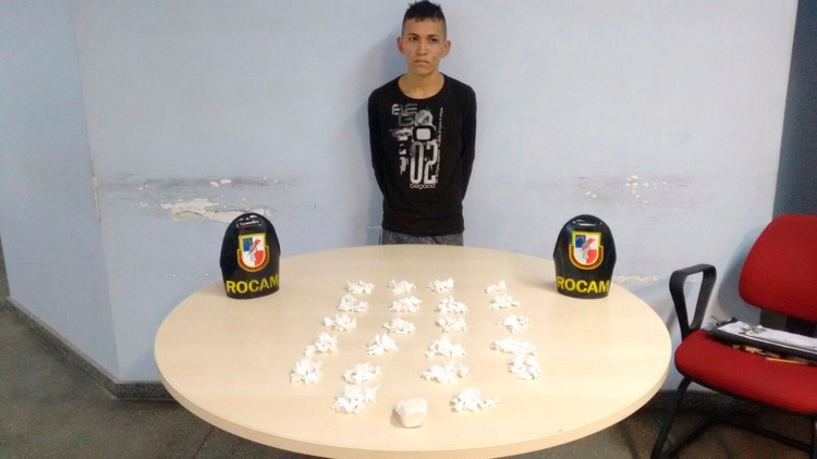 Os militares foram ao local e apreenderam em posse do suspeito 215 trouxinhas de oxi e uma pedra de 50g do mesmo entorpecente.