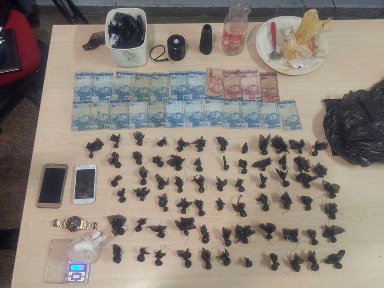 Ao chegar no endereço citado os PMs apreenderam com os suspeitos porções pequenas de pasta base de cocaína, uma porção de 100g do mesmo entorpecente e material para embalo do entorpecente.