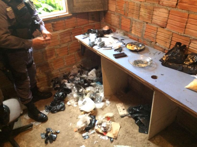 A princípio, na residência, foram encontradas porções de pasta a base de cocaína e oxi, mas numa busca mais minuciosa os PMs apreenderam mais 4 kg de pasta base de cocaína, uma pedra de 50g de oxi, balanças de precisão e material para embalo da droga.