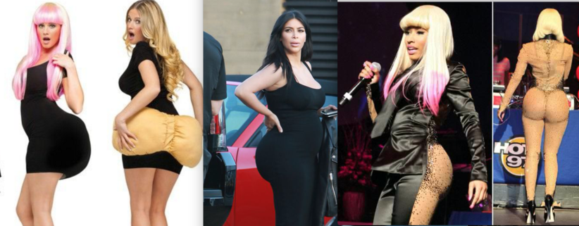 Kim Kardashian, Nicki Minaj ou outras personalidades popozudas: Compre um bundex ou se o orçamento estiver apertado, escolha um material que dê enchimento ao bumbum e seios. Depois disso, use um vestidinho colado e salto alto. Peruca é opcional, mas os cabelos devem imitar as celebridades para ficar mais parecido. No caso de Kim, cabelo partido ao meio ou penteado para trás, com gel. Já no de Nicki, uma peruca rosa funciona.