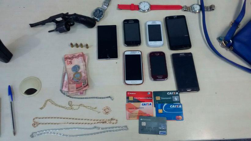 Os policiais militares da 3ª Companhia Interativa Comunitária (Cicom), comandados pelo tenente Reginaldo Oliveira, receberam a informação da ocorrência pelo Centro Integrado de Operações de Segurança (Ciops) e partiram em busca dos suspeitos. Os PMs encontraram o grupo na avenida Manaus 2000, no Japiim. Com eles foram apreendidos um revólver calibre 32 com quatro munições intactas, sete celulares, cordões de ouro, bolsas e carteiras porta-cédulas e a quantia de R$ 109,00. Todo o material foi roubado durante a ação criminosa contra funcionários e clientes. Além disso, o veículo utilizado para fuga, um Corsa Classic, de cor preta e placas JXX 7855, também era roubado.