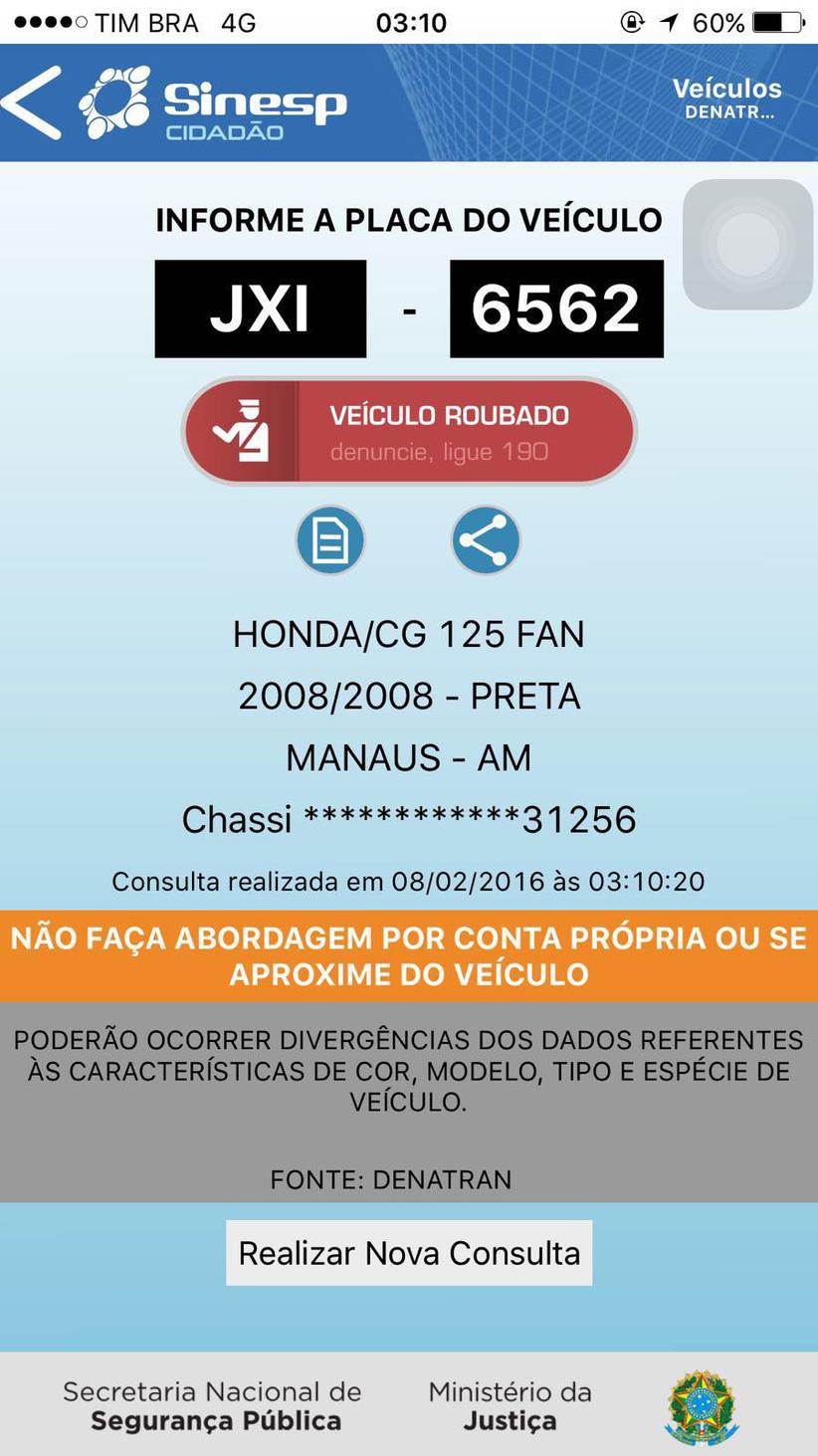 Os policiais militares da 4ª Companhia Interativa Comunitária (Cicom), sob o comando do tenente Luiz Ramos, faziam o patrulhamento na via quando notaram o homem em atitude suspeita na motocicleta Honda CG 125 Fan, de cor preta e placa JXI 6562. Após abordá-lo, verificaram que a placa do veículo estava adulterada com uma fita isolante. Ao checarem no nome do suspeito no sistema, perceberam que ele já tinha passagens pelos crimes de tráfico, roubo e furto.