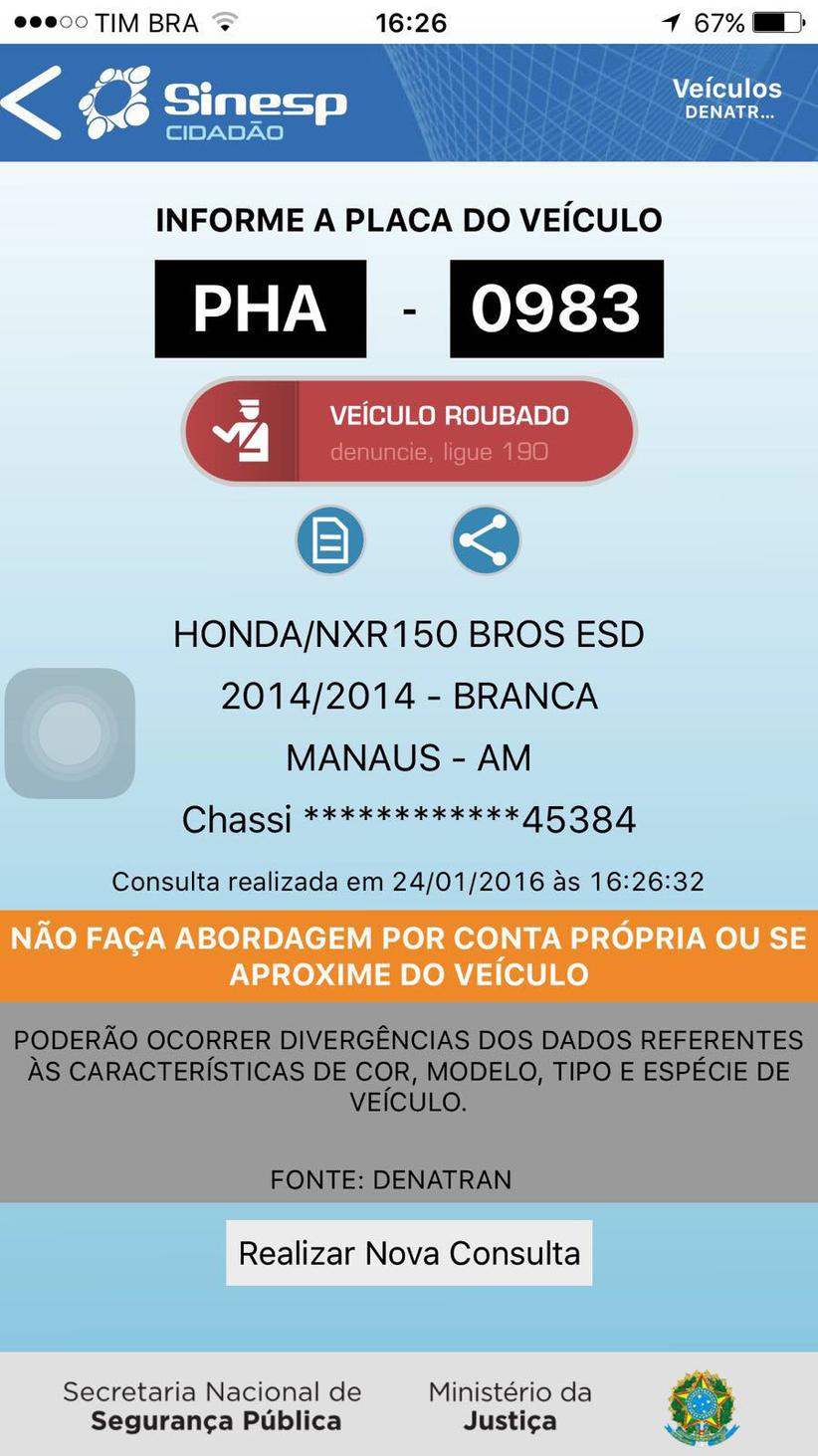 Os policiais militares da 4ª Companhia Interativa Comunitária (Cicom), sob o comando do aspirante Luiz Ramos, faziam o patrulhamento no bairro quando viram o jovem em atitude suspeita conduzindo a motocicleta Honda Bros, de cor branca e placa OAC 9621. Ao abordarem o rapaz constataram que o chassi do veículo estava adulterado e não condizia com a numeração do motor.