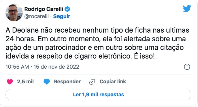A transmissão foi cortada antes que Deolane pudesse responder. Após a repercussão negativa entre o público e a suspeita de que a peoa têm recebido informação externa, o diretor do programa, Rodrigo Carelli, se pronunciou: “A Deolane não recebeu nenhum tipo de ficha nas últimas 24 horas. Em outro momento, ela foi alertada sobre uma ação de um patrocinador e em outro sobre uma citação indevida a respeito de cigarro eletrônico. É isso!”.