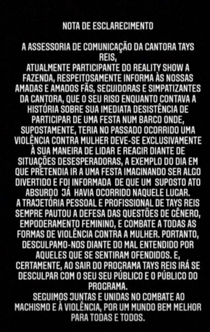 Com a repercussão do caso, assessoria de comunicação da peoa se manifestou e esclareceu a risada da cantora. Confira nota na íntegra abaixo: