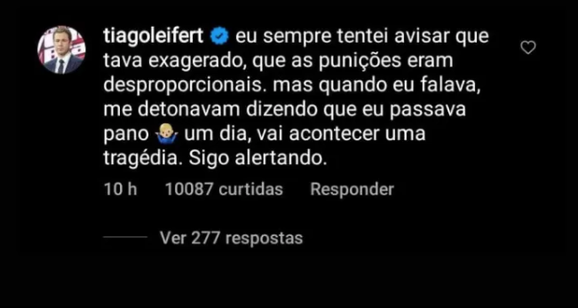 "Eu sempre tentei avisar que tava exagerado, que as punições eram desproporcionais. Mas quando eu falava, me detonavam dizendo que eu passava pano. Um dia, vai acontecer uma tragédia. Sigo alertando", escreveu o jornalista.