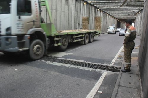 Foi necessária a intervenção de agentes de trânsito para sinalizar o problema, até que uma carreta passou e, com o peso do veículo, recolocou a grade no local.