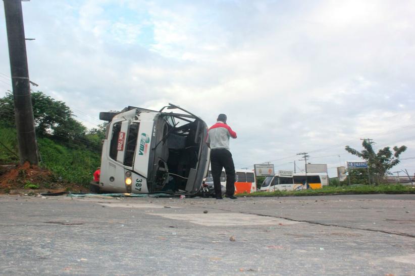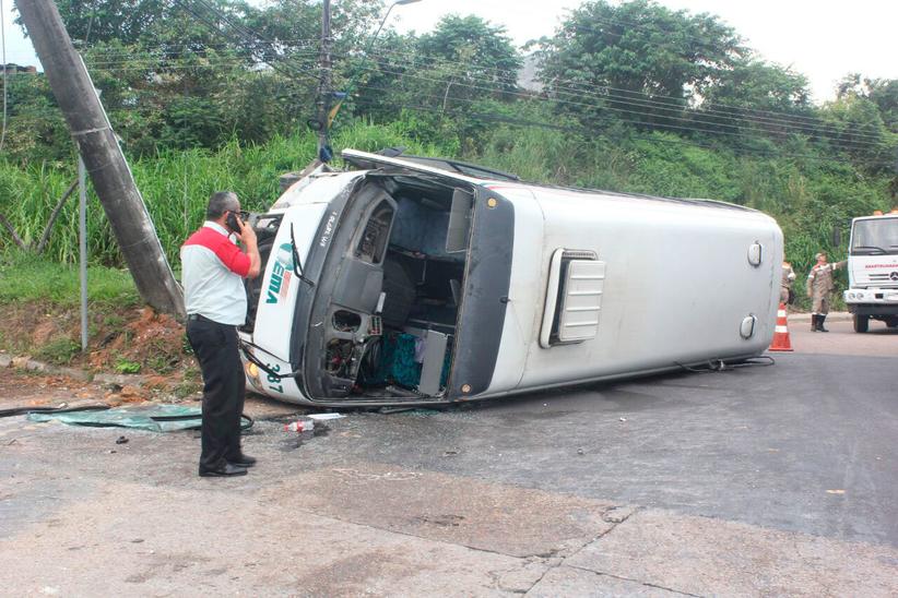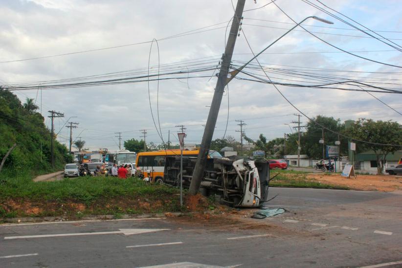 Manaus|AM - Na manhã desta quarta-feira (27) um micro-ônibus da empresa Tema Transportes virou ao colidir em alta velocidade com um poste de energia na avenida Buriti, bairro Distrito Industrial, zona Sul da capital. O acidente ocorreu por volta das 5h na entrada do conjunto Nova República.
