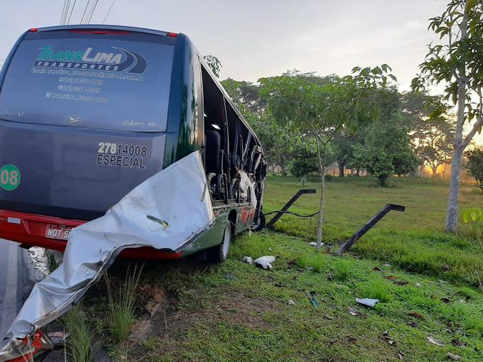 No acidente, toda a lateral direita do micro-ônibus foi completamente arrancada. Passageiros sofreram ferimentos e ficaram expostos aguardando socorro. Mais informações em instantes.