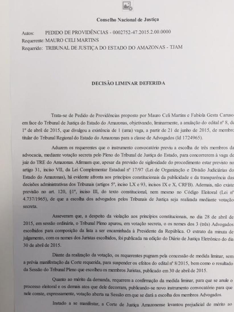 A conselheira Ana Maria Duarte Amarante, do Conselho Nacional de Justiça, suspendeu a eleição realizada pelo Tribunal de Justiça do Amazonas para escolha de lista tríplice para juiz do TRE, vaga averta com o término do mandato do advogado Délcio dos Santos. O argumento do pedido de providência feito ao CNJ foi o de que a votação foi secreta, contrariando decisão anterior do próprio Conselho Nacional de Justiça, pelo voto aberto.