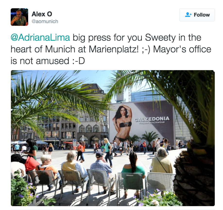 Um outdoor que mostra Adriana Lima de biquíni está dando o que falar na praça Marienplatz, ponto turístico famoso de Munique, na Alemanha. A publicidade de 114 metros quadrados, que está estampada diante do prédio da prefeitura, vem sendo alvo de muitas selfies de turistas mas também de reclamações.