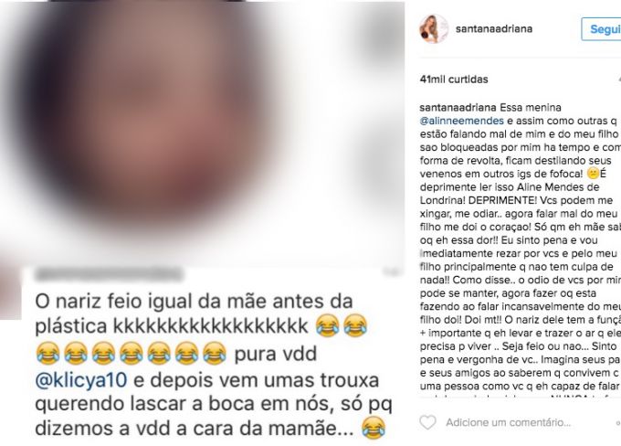 Adriana Sant’Anna se irritou depois que uma internauta criticou seu filho Rodrigo dizendo que o nariz da criança era “feio igual ao da mãe antes da plástico”.
