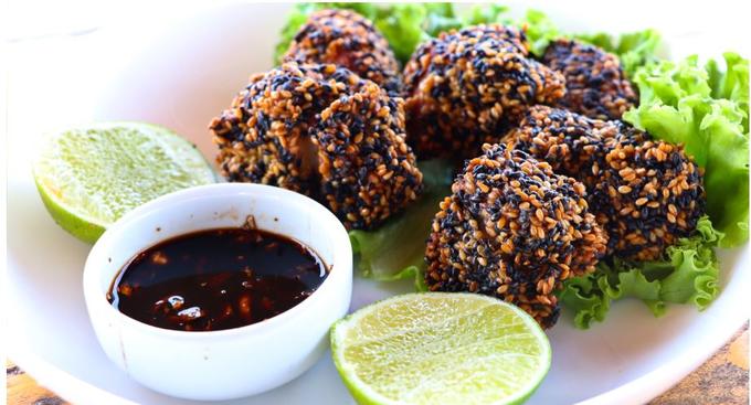 Bolinho de pirarucu empanado com gergelim branco e preto e acompanhado de molho shoyu e gengibre. Serve duas pessoas.