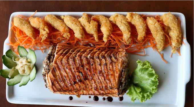 Lombo de salmão maçaricado, recheado com arroz japonês, cream cheese e shimeji. Acompanha 10 camarões empanados. Serve duas pessoas.