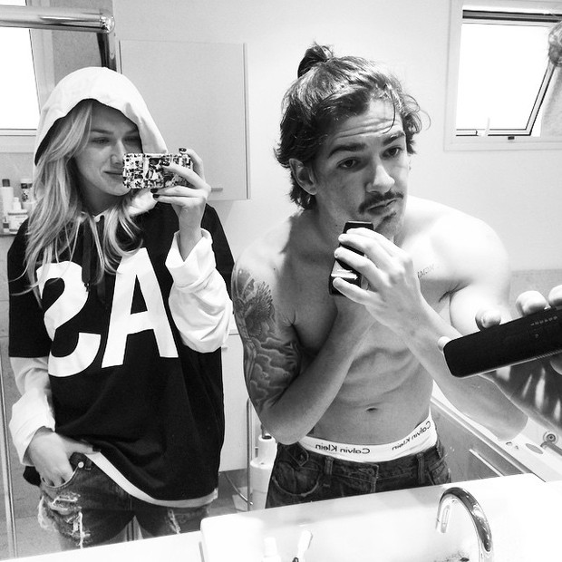 Na imagem, a atriz e o jogador aparecem no espelho: ele se barbeando, sem camisa e com a cueca aparecendo, e ela com um sorriso no rosto.