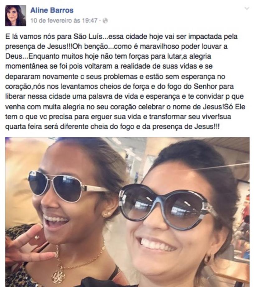 A cantora Aline Barros se envolveu em uma polêmica ao publicar uma mensagem em seu Facebook.