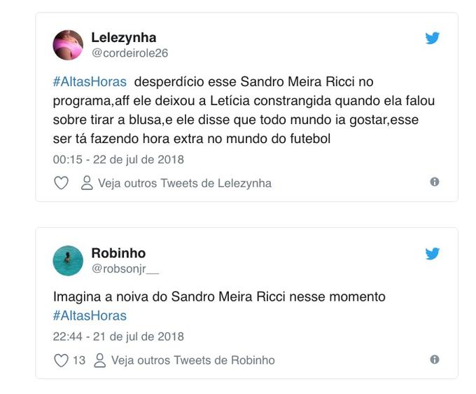 Vale lembrar que Sandro Meira Ricci está noivo da ex-auxiliar de arbitragem Fernanda Colombo. Já Letícia mora junto do ator Michel Melamed, com quem se considera casada.