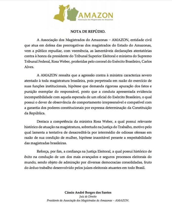 Manaus/AM - A Associação dos Magistrados do Amazonas (Amazon) emitiu uma Nota de Repúdio contra as ameaças proferidas pelo coronel do Exército Brasileiro, Carlos Alves, contra a presidente do Tribunal Superior Eleitoral (TSE), ministra Roda Weber.