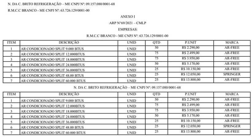 As empresas favorecidas na eventual aquisição dos equipamentos foram a N da C Brito Refrigeração e a RMCC Branco.