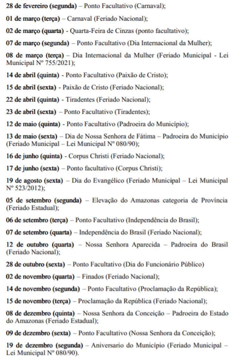 Careiro/AM – O calendário de pontos facultativos e feriados de 2022, da Prefeitura do Careiro, foi publicado na edição do Diário Oficial dos Municípios desta quarta-feira, dia 21 de dezembro, e prevê quase um mês de folga para os servidores daquele município.