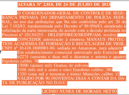 A Polícia Federal concedeu autorização para a Academia de Formação de Vigilantes Protection, com sede em Manaus, a adquirir em estabelecimento comercial autorizado pelo Exército Brasileiro, 15 mil gramas de pólvora, 62.274 espoletas calibre 38 e mais 1.220 munições calibre 12. O alvará, publicado no Diário Oficial da União desta quinta-feira, tem validade de 90 dias e é assinado pelo Coordenador Geral de Controle de Segurança Privada da PF, delegado Licímoio Nunes de Moraes neto.