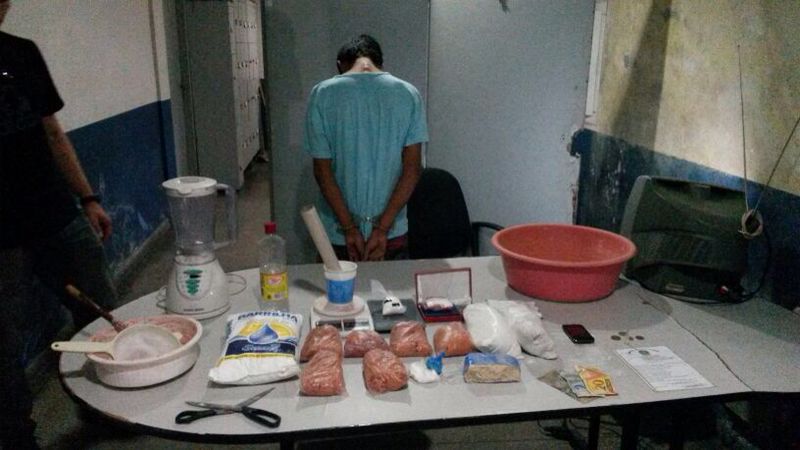 Segundo os policiais, o menor mantinha uma quitinete na Rua Brasil no bairro Redenção, onde funcionava um laboratório. No local a policia encontrou dois quilos de pasta-base de cocaína, outra quantidade de substância, supostamente cocaína, três balanças de precisão, material para misturar e embalar entorpecentes. "Recebemos a informação de que o menor mantinha um laboratório onde produzia os entorpecentes para abastecer a zona Norte de Manaus," conta um dos policiais.