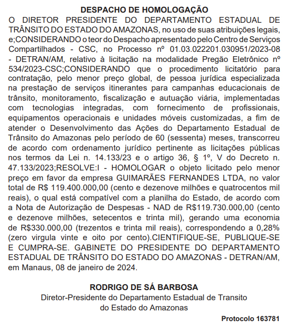 De acordo com edição do último dia 8 do Diário Oficial, a empresa Guimarães Fernandes Ltda., sediada em Boa Vista (RR), foi contratada para prestar “serviços itinerantes” pelo prazo de cinco anos por R$ 119,730 milhões.