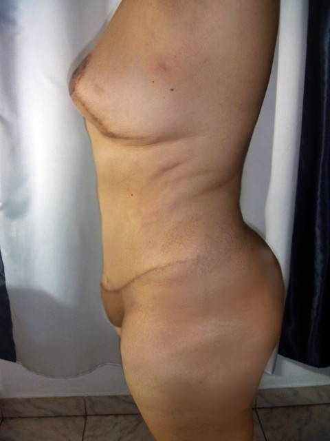 Emília afirma que nos pontos da abdominoplastia, próximos a região pubiana, tem pedaços de tecidos retorcidos cheios de linhas que estão sempre inflamados . Disse que tem de fazer sessões de punção para retirada de pus da região, pois não há antibióticos que combata essa colônia de bactérias.