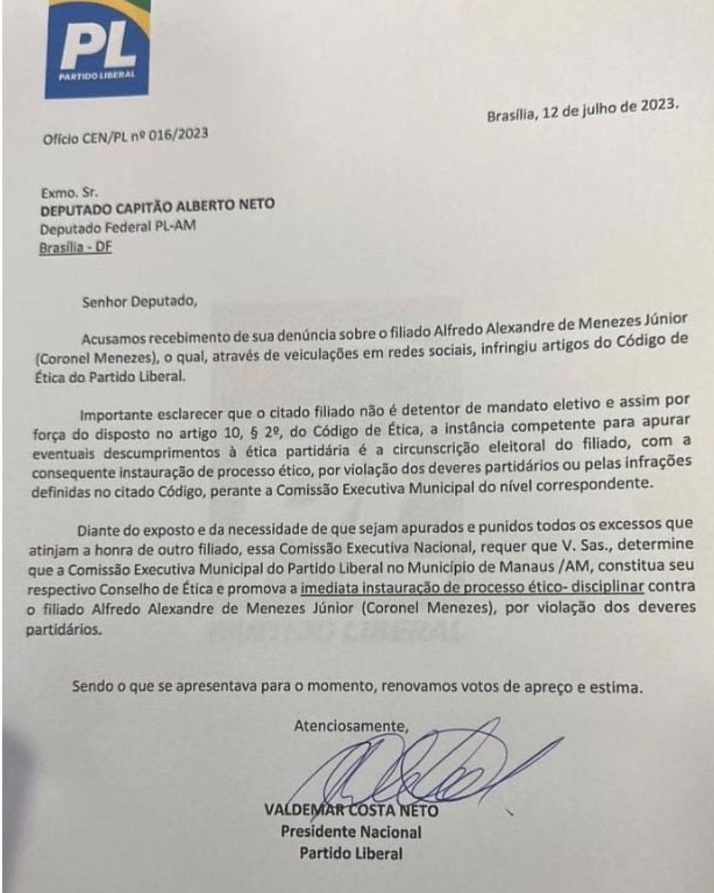 Por não ter mandato, Menezes será investigado pelo Conselho de Ética do PL em Manaus.
