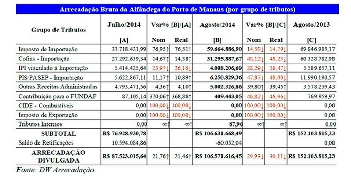 A Alfândega do Porto de Manaus no mês de agosto de 2014 arrecadou R$ 59,66 milhões em Imposto de importação (II), representando uma queda de 14,58 % sobre igual período do ano passado, R$ 69,85 milhões.