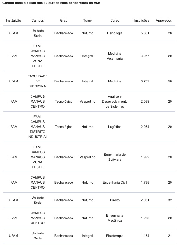 A concorrência foi acirrada: o Amazonas contabilizou 71.029 inscrições (considerando a opção de até dois cursos por candidato). O destaque de demanda ficou para a Universidade Federal do Amazonas (UFAM), onde o curso de Psicologia (Bacharelado) se consolidou como o mais procurado desta edição.