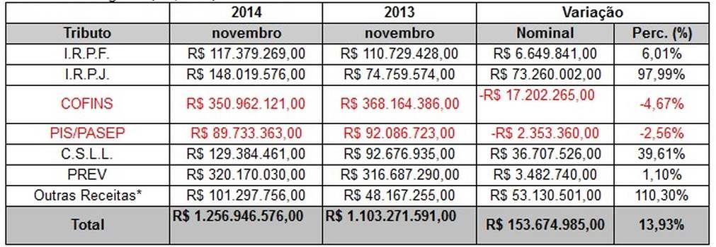 A arrecadação acumulada no período janeiro/novembro de 2014 totalizou R$ 12,173 bilhões, contra R$ 11,076 bilhões em janeiro/novembro de 2013, apresentando uma variação nominal de 9,90%.