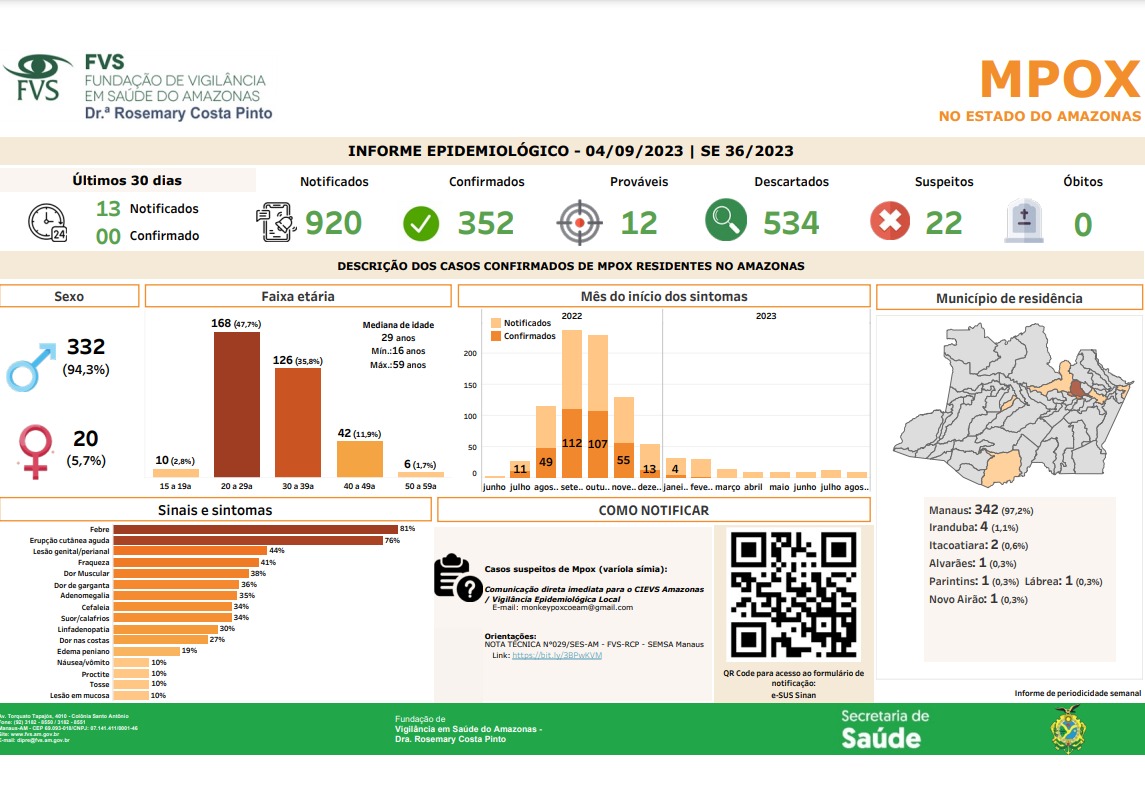 Manaus/AM - A Fundação de Vigilância em Saúde do Amazonas divulgou nesta terça-feira (5) novo informe epidemiológico da Mpox no estado. De acordo com os dados, o Amazonas completou seis meses sem registrar novos casos da doença, o último ocorreu em fevereiro.