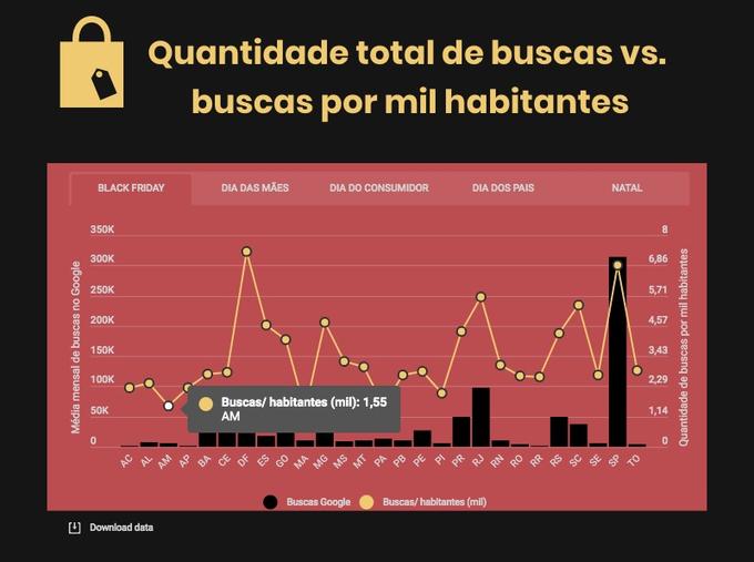 No estudo, comparou-se cada estado brasileiro, assim como sua população, para entender em que unidade federativa mais se busca cada uma dessas datas do e-commerce. No topo da lista, está o Distrito Federal, com 7,38 buscas por cada mil habitantes, seguido por São Paulo, com 6,85. Já estado do Amazonas é o 25º nesse quesito, sendo o terceiro que menos busca por ‘Black Friday’ no país, com 1,5 buscas por mês a cada mil habitantes.