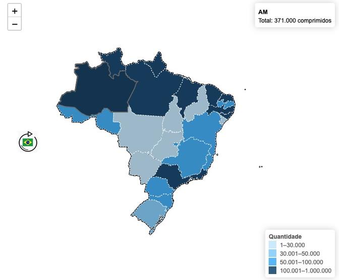 Os estados que mais receberam os comprimidos foram: São Paulo (686 mil), Pará (439 mil) e Alagoas (412 mil). O Amazonas, com 371 mil comprimidos, recebeu mais do que Roraima (340 mil), Ceará (302 mil) e Rio de Janeiro (224 mil).