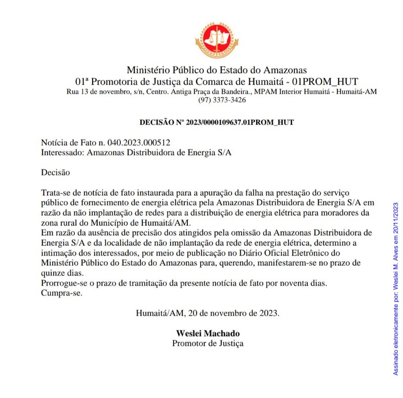 Manaus/AM - O promotor de Justiça de Humaitá, Weslei Machado, intimou a concessionária Amazonas Energia a explicar o motivo de não ter implantado redes para distribuição de energia elétrica na zona rural do município.A decisão foi publicada nesta terça-feira (20) no diário oficial.