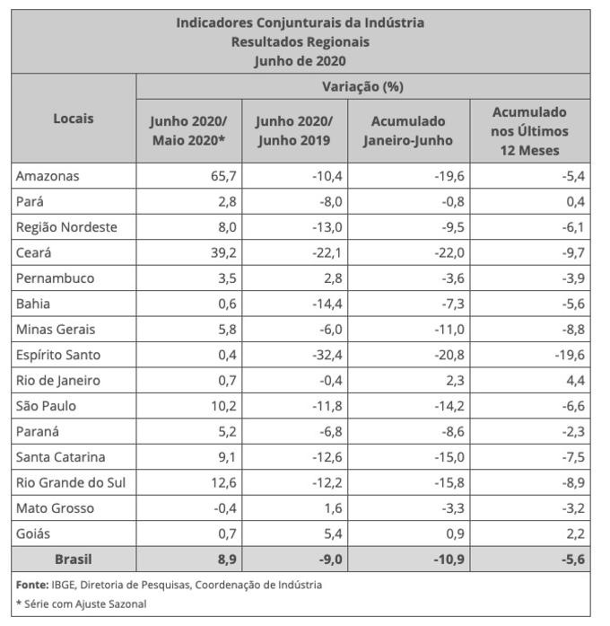Manaus/AM - Em junho de 2020, 14 dos 15 locais pesquisados tiveram taxas positivas na comparação com maio, na série com ajuste sazonal. Os maiores avanços foram no Amazonas (65,7%) e no Ceará (39,2%). As informações são da Pesquisa Industrial Mensal (PIM) Regional do Instituto de Geografia e Estatística (IBGE).