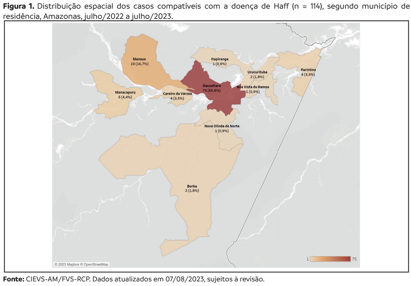 Os municípios com casos da doença são: Boa Vista do Ramos, Borba, Careiro da Várzea, Itacoatiara, Itapiranga, Manaus, Manacapuru, Nova Olinda do Norte, Parintins e Urucurituba.