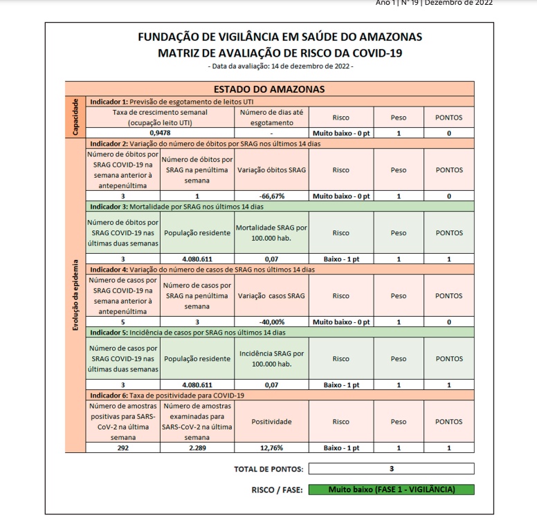 O boletim é consolidado com base em indicadores de casos, óbitos, hospitalizações, cobertura vacinal e vigilância genômica. Especificamente de Covid-19, a análise epidemiológica atualizada corresponde ao período dos últimos dois meses (12 de outubro a 12 de dezembro) com destaque para o período de 14 dias que vai de 29 de novembro a 12 de dezembro.