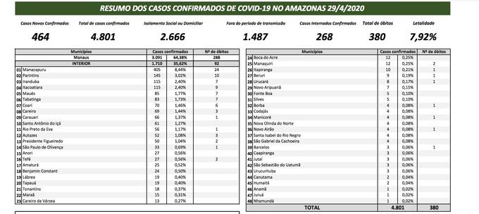 Manaus/AM - Em somente 24 horas, o Amazonas atingiu o recorde de 464 novos casos confirmados de Covid-19 nesta quarta-feira (29), totalizando 4.801. Segundo a Fundação de Vigilância em Saúde, os óbitos confirmados pelo novo coronavírus somam 380 em todo o Estado, 29 mortes a mais que na terça-feira.