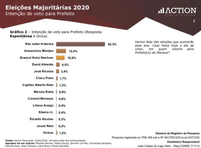 A pesquisa foi realizada entre os dias 6 e 7 deste mês com 1.100 eleitores e está registrada no TRE sob numero AM-07587/2020. Veja os diversos cenários.