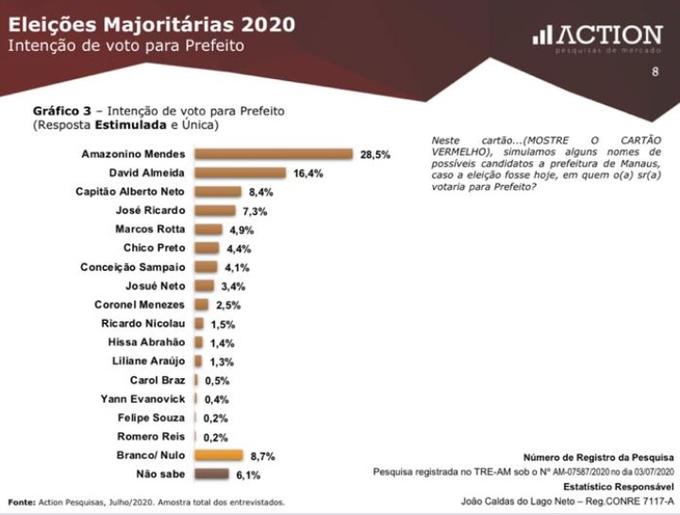 Pesquisa Action com pre-candidatos a Prefeitura de Manaus, mostra a liderança do ex-governador Amazonino Mendes, com 28,5 % da preferência do eleitorado.