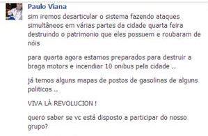 Anda circulando no Facebook uma ameaça de um rapaz chamado Paulo Viana. A informação deixou membros da Polícia Militar em alerta. De acordo com a postagem, os manifestantes vão fazer ataques simultâneos em várias partes da cidade, incendiar postos de gasolina ônibus.