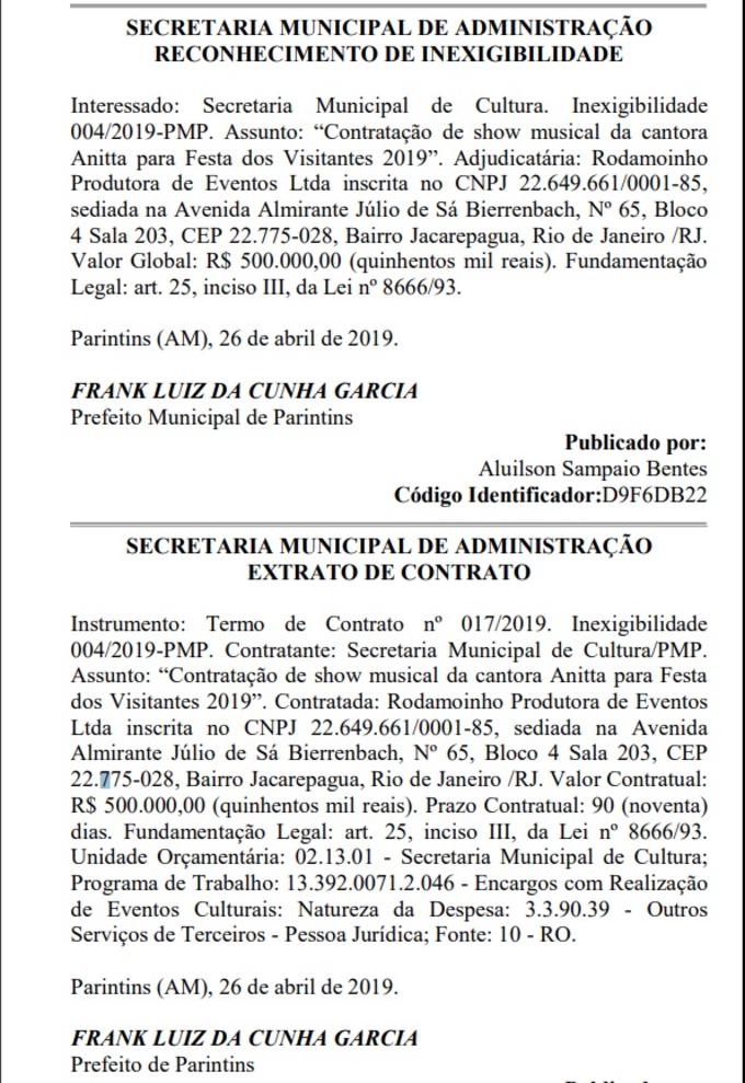 O prefeito de Parintins Bi Garcia é quem assina o Reconhecimento de Inexigibilidade e também o Extrato de Contrato publicados no Diário Oficial. A contratação de Anitta foi realizada por meio da empresa Rodamoinho Produtora de Eventos Ltda, que pertence a cantora carioca.
