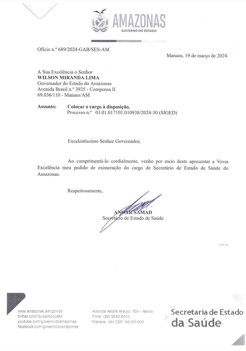 O médico Anoar Samad pediu exoneração do cargo de Secretário de Estado da saúde nesta terça-feira (19), em ofício encaminhado ao governador Wilson Lima.
