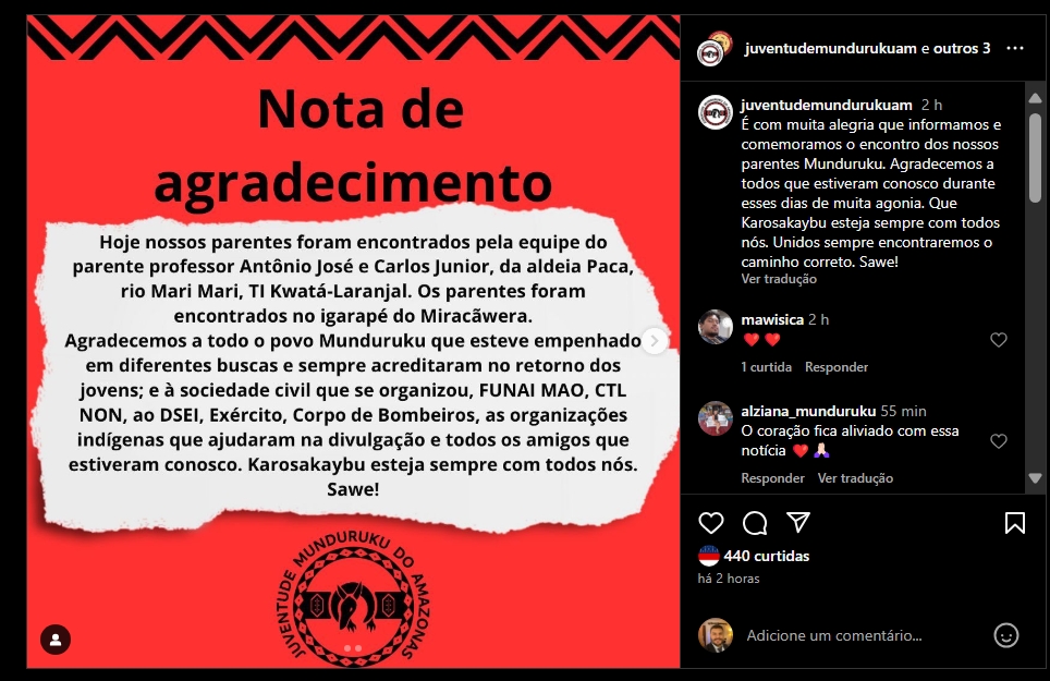"É com muita alegria que informamos e comemoramos o encontro dos nossos parentes Munduruku. Agradecemos a todos que estiveram conosco durante esses dias de muita agonia. Que Karosakaybu esteja sempre com todos nós. Unidos sempre encontraremos o caminho correto. Sawe!", diz o comunicado.