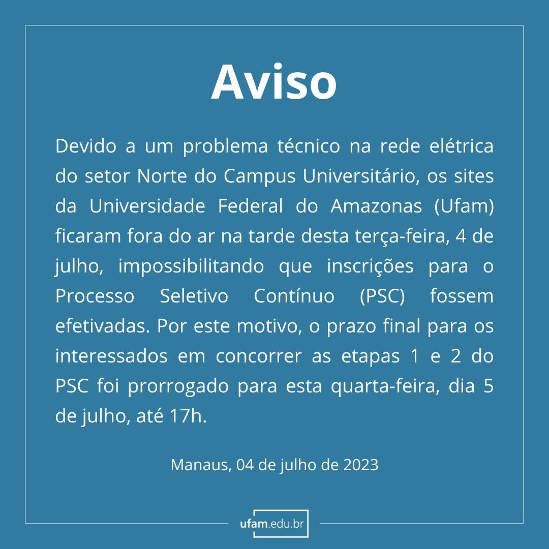 Manaus/AM - O prazo de inscrições para a 1ª e 2ª etapas do Processo Seletivo Contínuo (PSC) 2023 foi prorrogado até as 17h desta quarta-feira (5) após o site da instituição apresentar instabilidade.