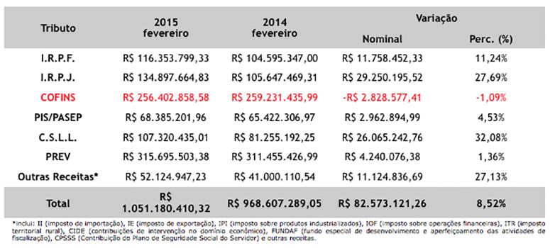 Somente a Cofins contribuiu negativamente para o resultado. A arrecadação foi de 256,4 milhões em 2015, 1,09% menor que os 259,2 milhões arrecadados em fevereiro de 2014.