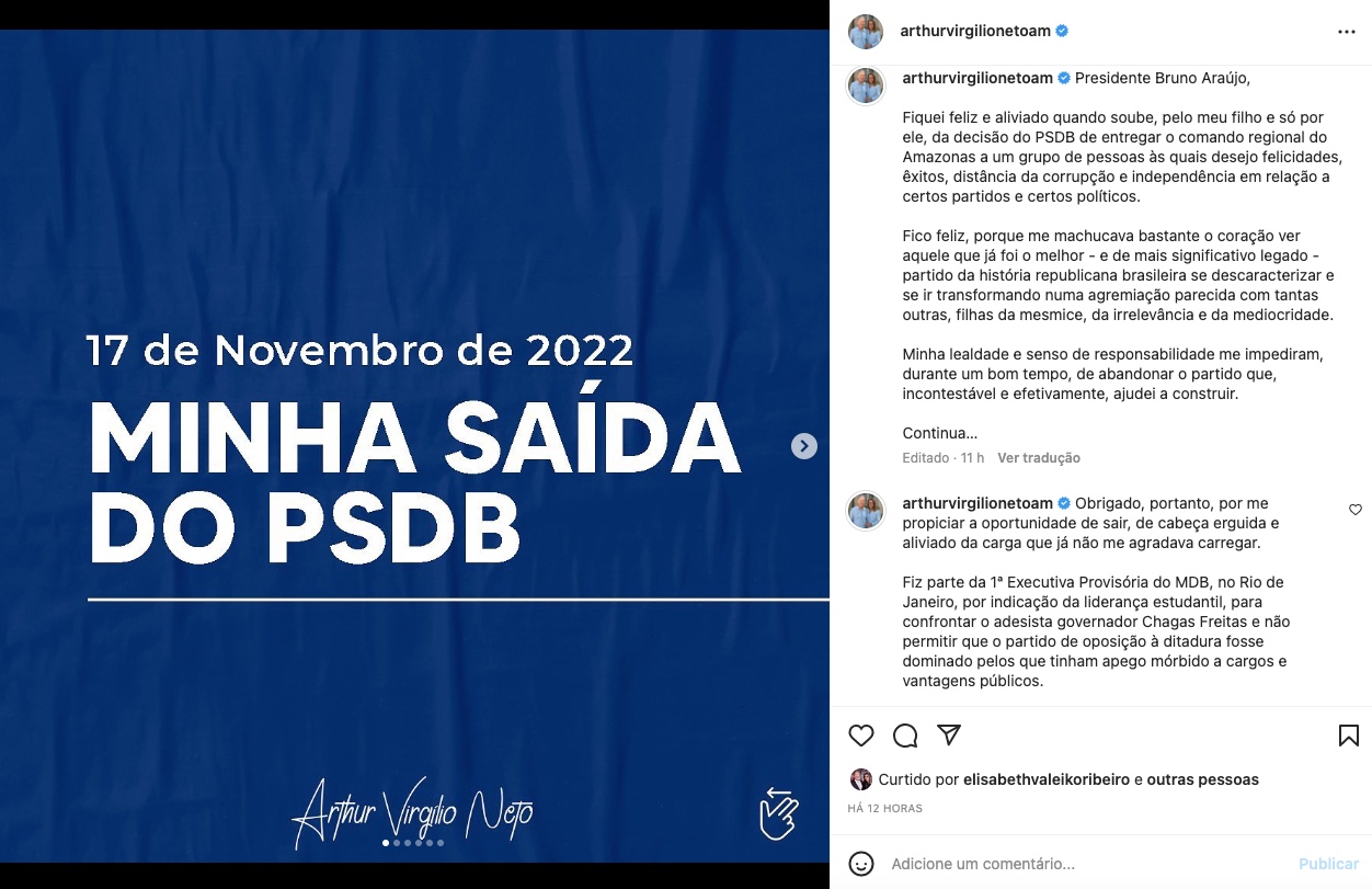 Manaus/AM - O ex-prefeito de Manaus, Arthur Virgílio Neto (PSDB), anunciou a sua saída do PSDB, partido que ajudou a fundar e que estava filiado há quase 35 anos. O comunicado ocorreu na noite desta quinta-feira (17), por meio de suas redes sociais.